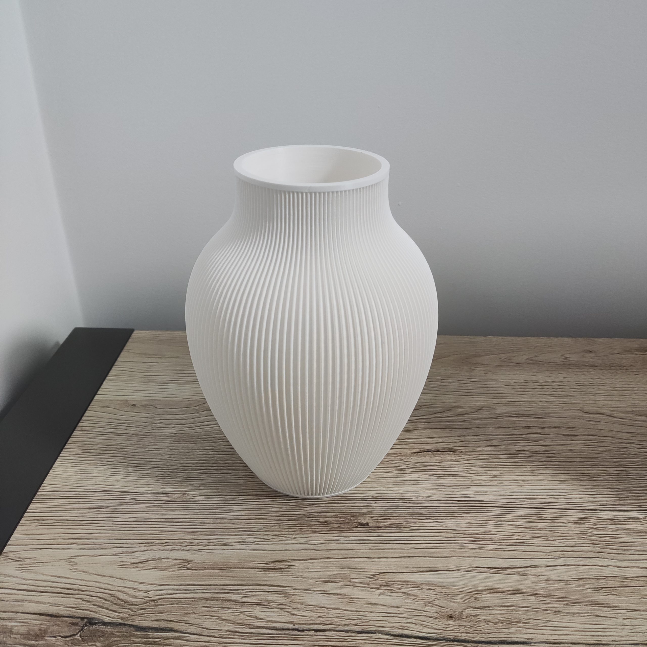 Minimalistyczny biały wazon o subtelnych pionowych żłobieniach to idealne połączenie prostoty i elegancji.