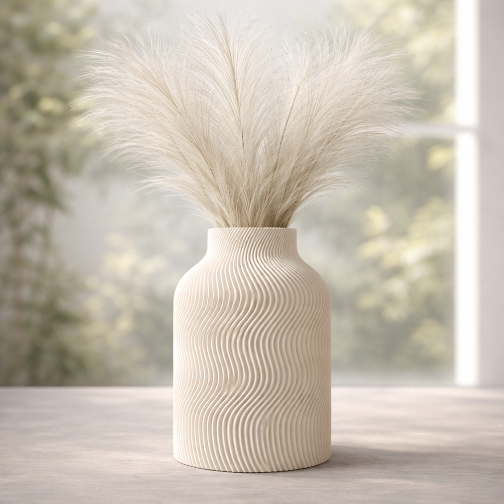 Wazon Luna to połączenie nowoczesnej formy z subtelną elegancją inspirowaną stylem Japandi. Delikatnie falowana powierzchnia nadaje mu rzeźbiarski charakter, który przyciąga wzrok, a jednocześnie doskonale wpisuje się w spokojne, harmonijne wnętrza.