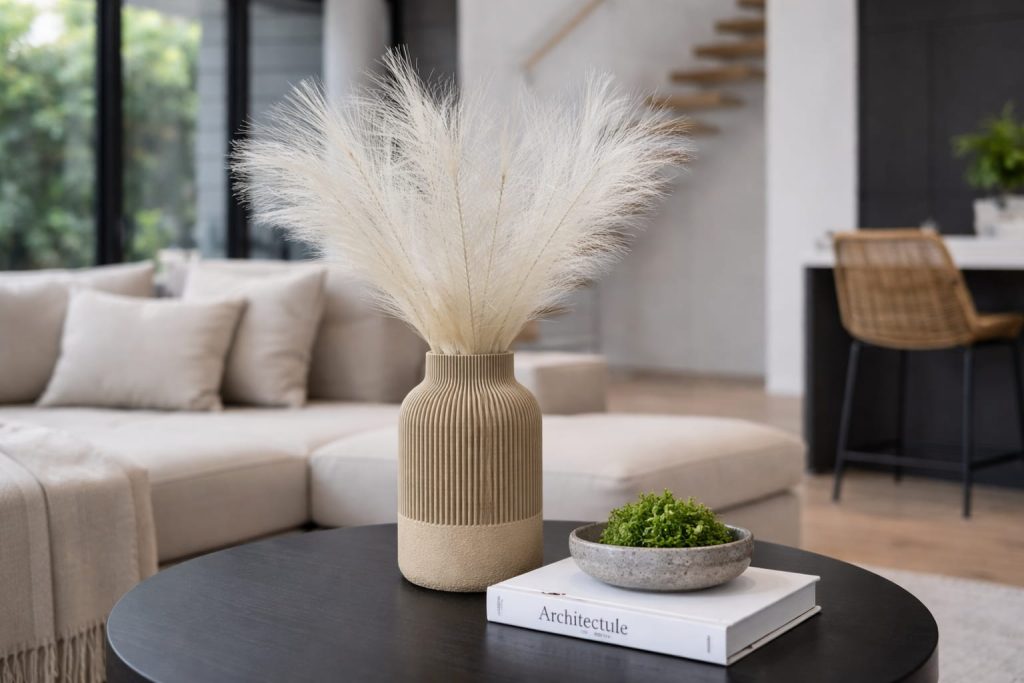 Minimalistyczny beżowy wazon o subtelnych pionowych żłobieniach to idealne połączenie prostoty i elegancji. Wypełniony dekoracyjną trawą pampasową w jasnym odcieniu, wprowadzi do Twojego wnętrza naturalną harmonię i lekkość.